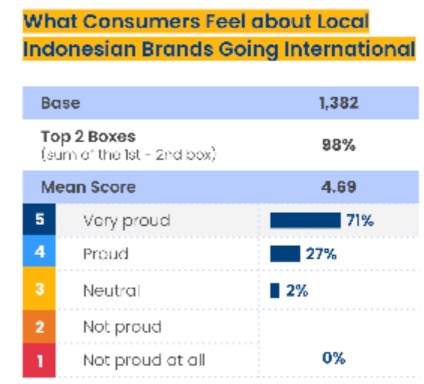 Pergeseran ini terjadi berdampingan dengan meningkatnya kebanggaan terhadap identitas lokal. Sebanyak 98% konsumen Indonesia merasa bangga ketika brand lokal berhasil masuk pasar global. Tak hanya kualitas produk yang dianggap semakin kompetitif dan memenuhi standar internasional, faktor seperti harga, reputasi, dan identitas lokal turut memperkuat persepsi positif terhadap brand lokal yang mendunia. Bahkan, lebih dari 90% responden menilai penting bagi brand untuk tetap mempertahankan identitas lokal saat ekspansi global.