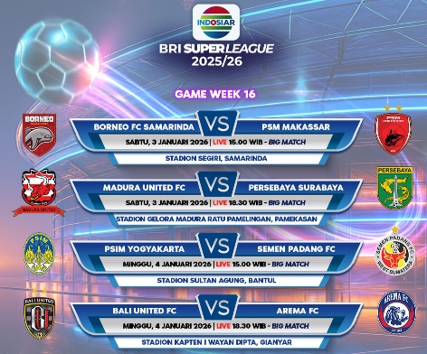 Memasuki Game Week 16 BRI Super League 2025/26, akhir pekan depan pemirsa Indosiar akan ditemani dengan laga yang mempertemukan BORNEO FC SAMARINDA yang saat ini memegang posisi pertama dalam klasemen sementara dengan PSM MAKASSAR yang disiarkan langsung dari Stadion Segiri, Samarinda pada pukul 15.00 WIB. Masih di hari yang sama, Bajul Ijo akan bertandang ke markas MADURA UNITED FC di Stadion Gelora Madura Ratu Pamelingan, Pamekasan pukul 18.30 WIB.